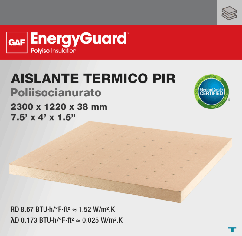 Panel aislante de poliisocianurato EnergyGuard™ está fabricado con revestimientos de fieltro celulósico reforzado con fibra de vidrio adheridos a un núcleo de espuma de poliisocianurato..