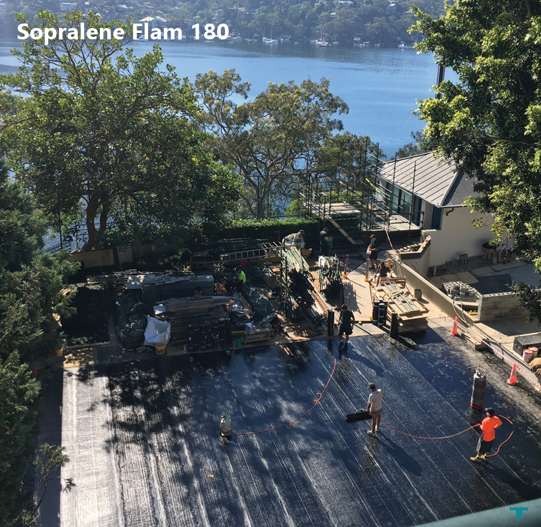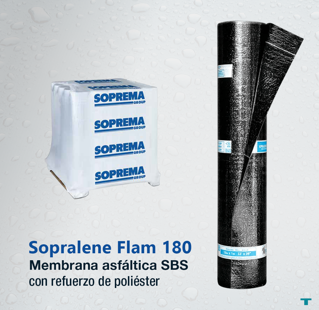 SOPRALENE® FLAM 180 es una serie de membranas flexibles reforzadas de betún modificado con SBS para su uso en sistemas monocapa o multicapa y tapajuntas homologados. Está compuesta por una fórmula patentada de betún modificado con polímero elastomérico de estireno-butadieno-estireno (SBS) y reforzada con una estera de poliéster no tejido, resistente y dimensionalmente estable. La cara superior está revestida con película termofusible o escamas de pizarra, y la cara inferior con película termofusible.